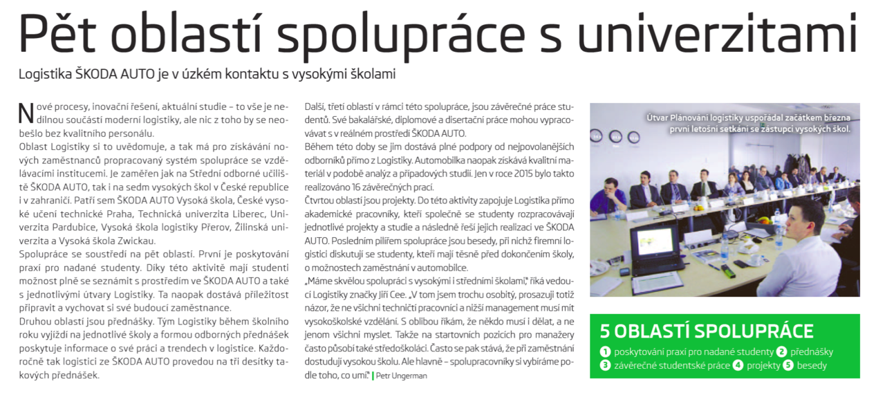 Our colleague Mr. František Manlig took part in meeting between Skoda Auto, Department of Logistics Planning and delegates of different universities. One of the topics wat was discussed is a subject of master and bachelor theses which can be realize in Skoda Auto plants. More information you can find in the paper.